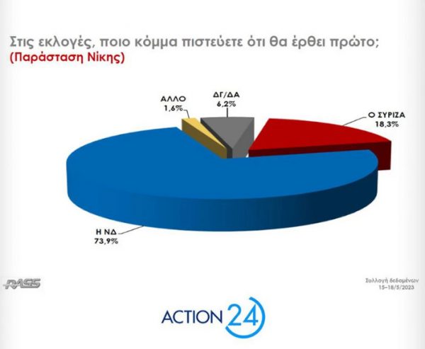 Στην παράσταση νίκης, η Νέα Δημοκρατία φαντάζει το απόλυτο φαβορί στη συνείδηση των περισσότερων συγκεντρώνοντας ποσοστό 73,9% έναντι 18,3% του ΣΥΡΙΖΑ. Άλλο κόμμα απαντά το 1,6% των ερωτηθέντων.