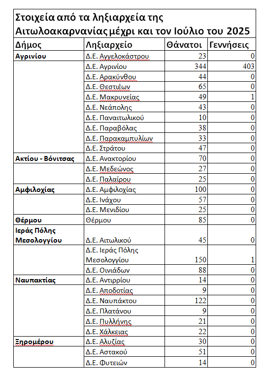 Μέχρι και τον Ιούλιο του 2025 καταγράφονται 1.660 ληξιαρχικές πράξεις θανάτων και μόλις 405 γεννήσεις. Το εξόχως θλιβερό είναι ότι σχεδόν το σύνολο των γεννήσεων (δείτε στον πίνακα) καταγράφονται στη Δημοτική Ενότητα Αγρινίου, στην πόλη του Αγρινίου δηλαδή (403), ενώ σε όλη την υπόλοιπη Αιτωλοακαρνανία και στη λοιπή περιφέρεια του Δήμου Αγρινίου οι γεννήσεις είναι μηδενικές… Εντυπωσιάζει και τρομάζει ταυτόχρονα πως τουλάχιστον στο επτάμηνο του 2025 δεν καταγράφεται ούτε μια γέννηση στο Μεσολόγγι και στη Ναύπακτο, τις άλλες δύο μεγαλύτερες πόλεις της Αιτωλοακαρνανίας!