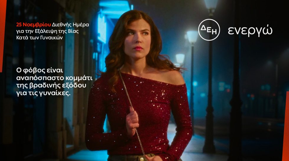 Για πέμπτη συνεχή χρονιά η ΔΕΗ συμμετέχει ενεργά στη Διεθνή Ημέρα για την Εξάλειψη της Έμφυλης Βίας, φωτίζοντας μια καθημερινή και βαθιά ριζωμένη εμπειρία ανασφάλειας, τον φόβο που βιώνουν γυναίκες όλων των ηλικιών κατά τη βραδινή τους έξοδο.