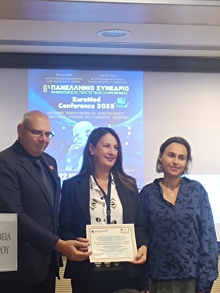 Η πρωτοβουλία βραβεύτηκε στην κατηγορία Best Practice Award για φορείς Τοπικής Αυτοδιοίκησης, στο πλαίσιο του 6ου Πανελληνίου Συνεδρίου Ψηφιοποίησης Πολιτιστικής Κληρονομιάς – EuroMed 2025, που πραγματοποιήθηκε από τις 19 έως τις 22 Νοεμβρίου, στο «Σπίτι της Κύπρου» (Πρεσβεία της Κυπριακής Δημοκρατίας), στην Αθήνα.