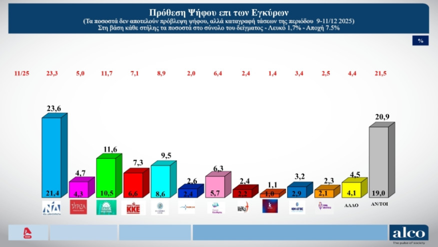 ALCO: Μικρή άνοδος για τη ΝΔ – Στάσιμο το ΠΑΣΟΚ – Απώλειες για ΣΥΡΙΖΑ, Πλεύση και Φωνή Λογικής