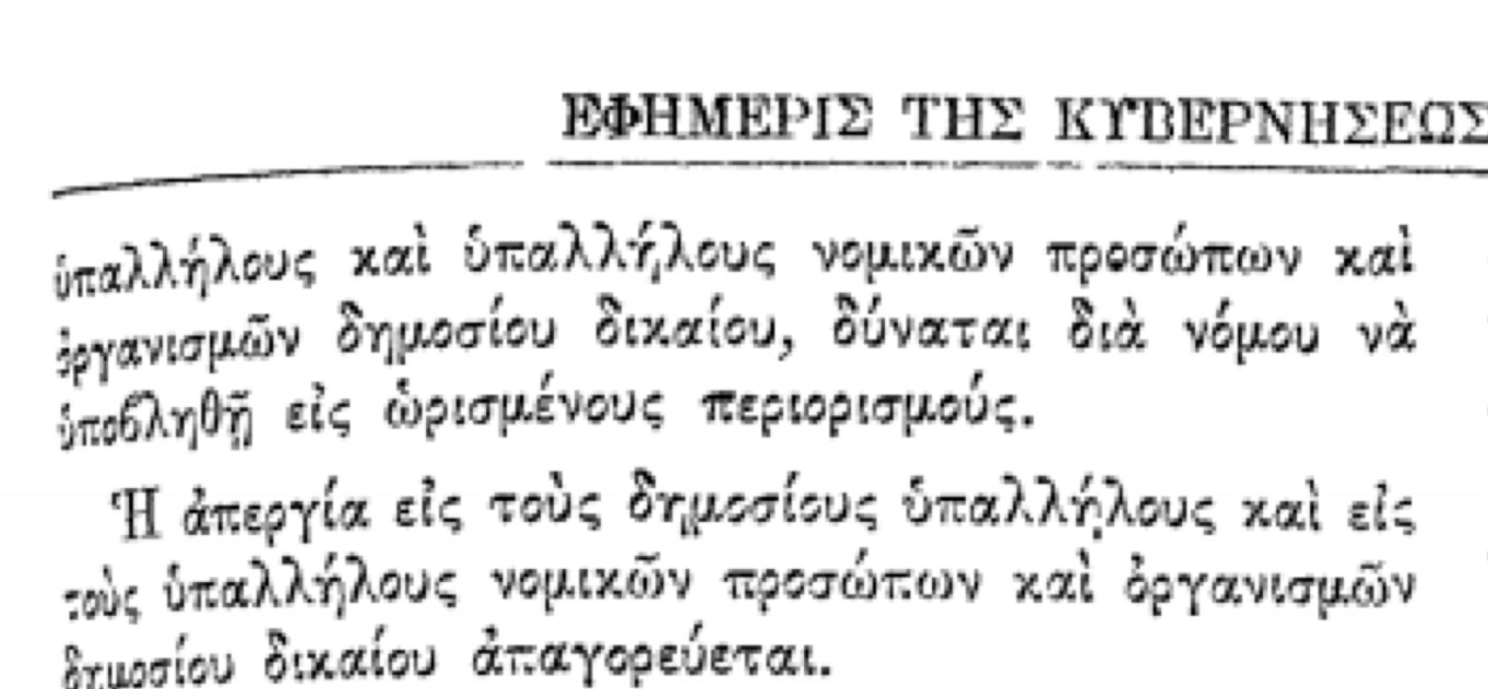 Το ΣΥΝΤΑΓΜΑ του 1952 το έγραφε με κάθε σαφήνεια στο άρθρο 11: “Η απεργία εις τους δημοσίους υπαλλήλους και εις τους υπαλλήλους νομικών προσώπων και οργανισμών δημοσίου δικαίου απαγορεύεται.”