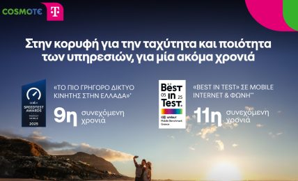 Η COSMOTE TELEKOM επιβεβαιώνει για ακόμη μία φορά την υπεροχή του δικτύου της, καταγράφοντας σημαντικές διακρίσεις για την ταχύτητα και ποιότητα των υπηρεσιών κινητής. Σύμφωνα με το Speedtest™ της Ookla®, το δίκτυο...