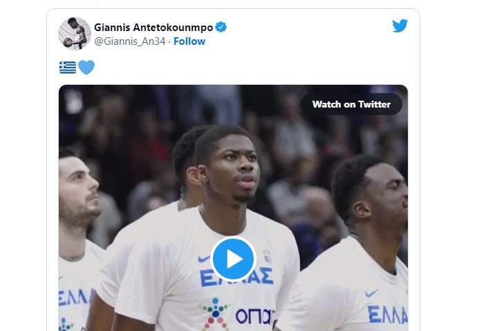 Ο Γιάννης Αντετοκούνμπο αντέδρασε ποστάροντας τον ίδιο και τους αδελφούς του Θανάση και Κώστα να ψάλλουν τον Εθνικό Ύμνο, συνοδεύοντας το tweet με μία ελληνική σημαία και μία καρδιά.