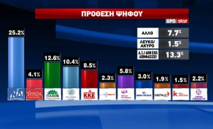 Άνοδο μισής μονάδα δίνει στη ΝΔ δίνει η δημοσκόπηση της GPO που παρουσιάστηκε στο κεντρικό δελτίο του Star.