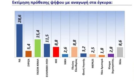 Ξεκάθαρο παραμένει το προβάδισμα της Νέας Δημοκρατίας έναντι του δεύτερου ΠΑΣΟΚ με τη δημοσκόπηση της GPO για τα Παραπολιτικά FM να δίνει 28,6% στην εκτίμηση ψήφου για το κυβερνών κόμμα.