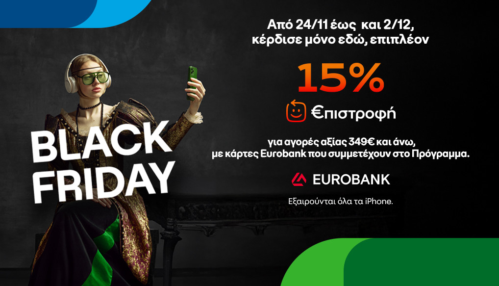 Οι καταναλωτές βρίσκουν -έως και τις 2 Δεκεμβρίου- smartphones, tablets, laptops, smartwatches, smart τηλεοράσεις, gaming και smart home προϊόντα, gadgets, ηχεία και ακουστικά ακόμα φθηνότερα και με έως 48 άτοκες δόσεις με χρήση πιστωτικής κάρτας[2], ή έως 36 δόσεις χωρίς κάρτα, για να επιλέξουν αυτό που τους ταιριάζει μέσα από μια μεγάλη γκάμα. Επιπλέον, από τις 24/11 έως και τις 2/12, κερδίζουν 15% €πιστροφή, κάνοντας αγορές συνολικής αξίας €349 και άνω με κάρτες Eurobank που συμμετέχουν στο Πρόγραμμα[3].