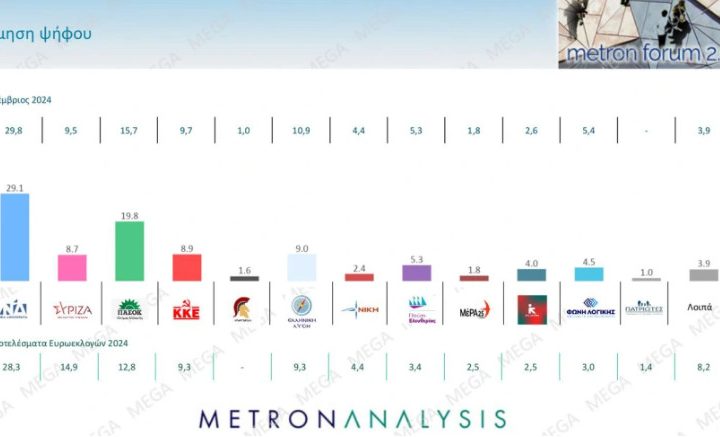 Η ΝΔ εξακολουθεί να έχει σημαντικό – αλλά μονοψήφιο – προβάδισμα 9,3 μονάδων στην εκτίμηση ψήφου: καταγράφεται στο 29,1%, με το ΠΑΣΟΚ στο 19,8% ( υψηλότερα από το ποσοστό του 17% που
