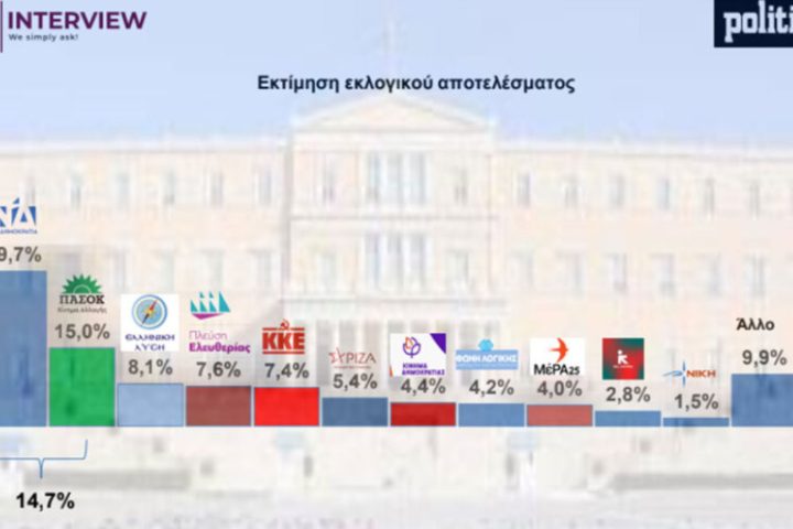 Στο 29,7% με κέρδη 3 μονάδες σε σχέση με την προηγούμενη έρευνα στις 11 Σεπτεμβρίου, μέτρησε στην εκτίμηση εκλογικού αποτελέσματος τη Νέα Δημοκρατία η δημοσκόπηση της Interview για την ιστοσελίδα Politic.gr.