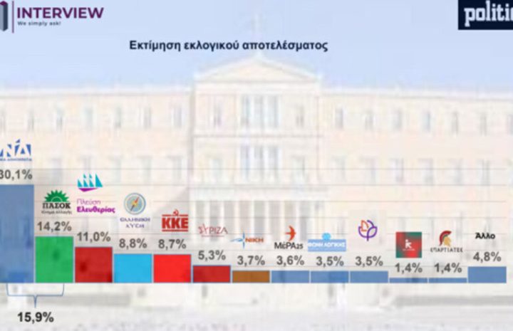 Στα επίπεδα του 30% κινείται η Νέα Δημοκρατία στη νέα δημοσκόπηση της Interview για την ιστοσελίδα politic.gr, με το κυβερνών κόμμα να έχει προβάδισμα 15,9% από το δεύτερο ΠΑΣΟΚ.