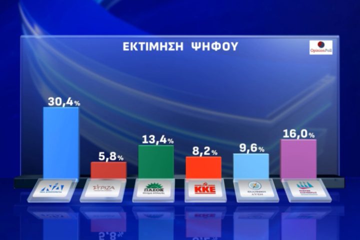 Η Ν.Δ αυξάνει κατά 0.4% την επίδοσή της στην εκτίμηση ψήφου στην έρευνα της Opinion Poll που παρουσιάστηκε στο κεντρικό δελτίο του Action 24 και φτάνει το 30.4%, αυξάνοντας μέσα σε 17 ημέρες στις 14,4 μονάδες (από 13,5)
