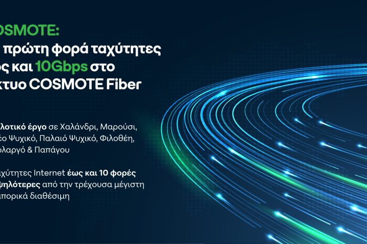 Ασύλληπτες ταχύτητες έως και 10Gbps μέσω οπτικών ινών φέρνει για πρώτη φορά η COSMOTE στο δίκτυο COSMOTE Fiber, υλοποιώντας πιλοτικό έργο σε περιοχές της Αττικής, όπως Χαλάνδρι, Μαρούσι, Νέο Ψυχικό, Παλαιό Ψυχικό,