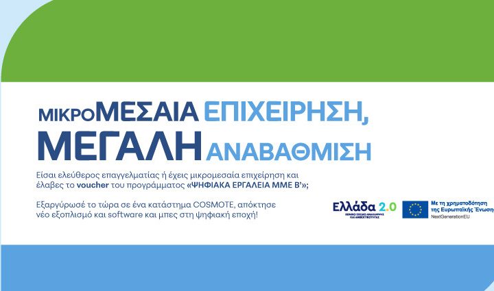 Πρόγραμμα «Ψηφιακά Εργαλεία ΜΜΕ Β’»: Εξαργύρωση του voucher έως 90% για αγορά τεχνολογικού εξοπλισμού σε COSMOTE και ΓΕΡΜΑΝΟ
