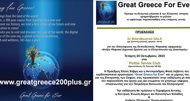 Η Πρόεδρος Ελένη Χόβρη και η Αντιπρόεδρος Φανή Λεβέντη του ΜΗ κερδοσκοπικού οργανισμού “Great Greece for Ever” και εκ μέρους του ΔΣ και της Επιτροπής των Σοφών, σας προσκαλούν στο μεγάλο φιλανθρωπικό