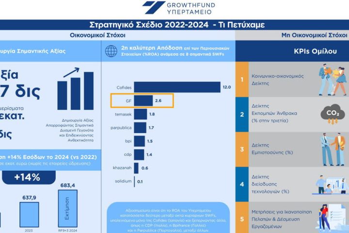 Δημιουργία σημαντικής οργανικής αξίας για την ελληνική οικονομία ύψους €700 εκατ. πέτυχε το Υπερταμείο/Growthfund κατά το διάστημα 2022-2024, με αύξηση των εσόδων κατά 14%, ενώ για το ίδιο διάστημα εισέπραξε €317 εκατ. σε μερίσματα και απέδωσε