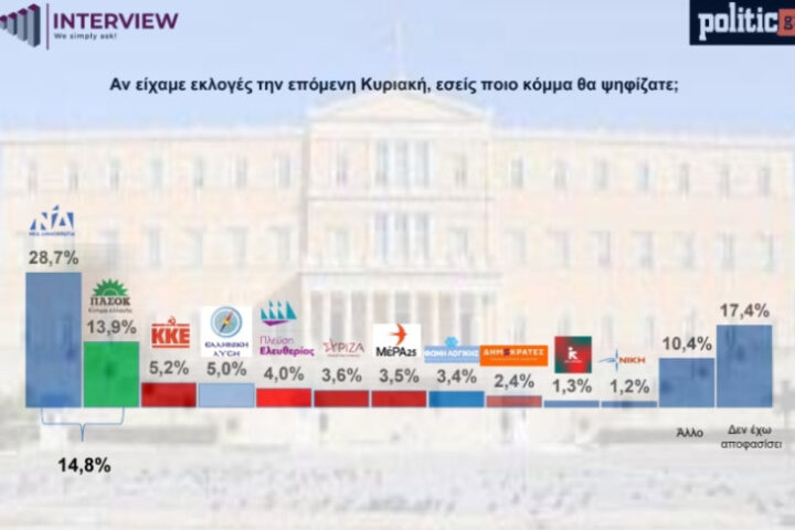 Interview: Στο 28,7% η ΝΔ – Στο 5% η Ελληνική Λύση – Στο 4% η Ζ. Κωνσταντοπούλου