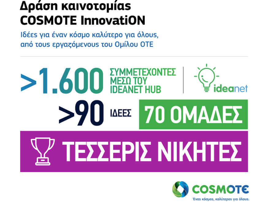 Τέσσερις καινοτόμες ιδέες που θα συμβάλλουν σε έναν κόσμο καλύτερο για όλους και αναμένεται να υλοποιηθούν από την COSMOTE, ανέδειξε η εσωτερική ψηφιακή δράση καινοτομίας InnovatiON, που πραγματοποιήθηκε στον Όμιλο ΟΤΕ. Πρόκειται για την εξέλιξη του Internal Hackathon του Ομίλου που αναζητούσε έξυπνες λύσεις στο νέο περιβάλλον που διαμόρφωσε ο COVID-19. Συνολικά, πάνω από 1.600 εργαζόμενοι κατέθεσαν ή στήριξαν, περισσότερες από 90 ιδέες καινοτομίας για να απλοποιήσουν την καθημερινότητα πελατών κι εργαζομένων, να δημιουργήσουν μοναδικές ψηφιακές εμπειρίες στους πελάτες, να βρουν λύση σε κάποιο κοινωνικό ή περιβαλλοντικό πρόβλημα, ή να προτείνουν ιδέες για την ψηφιακή αγορά του μέλλοντος (Market 4.0).