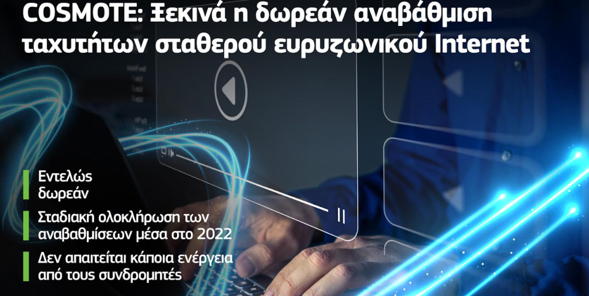 Ξεκινά η σταδιακή δωρεάν αναβάθμιση ταχυτήτων του σταθερού ευρυζωνικού internet για οικιακούς και εταιρικούς συνδρομητές COSMOTE, σε περιοχές που δεν έχει φτάσει ακόμη η οπτική ίνα μέχρι το σπίτι και την επιχείρηση και όπου αυτό είναι τεχνολογικά εφικτό. Η αναβάθμιση αναμένεται να ολοκληρωθεί μέσα στο 2022.
