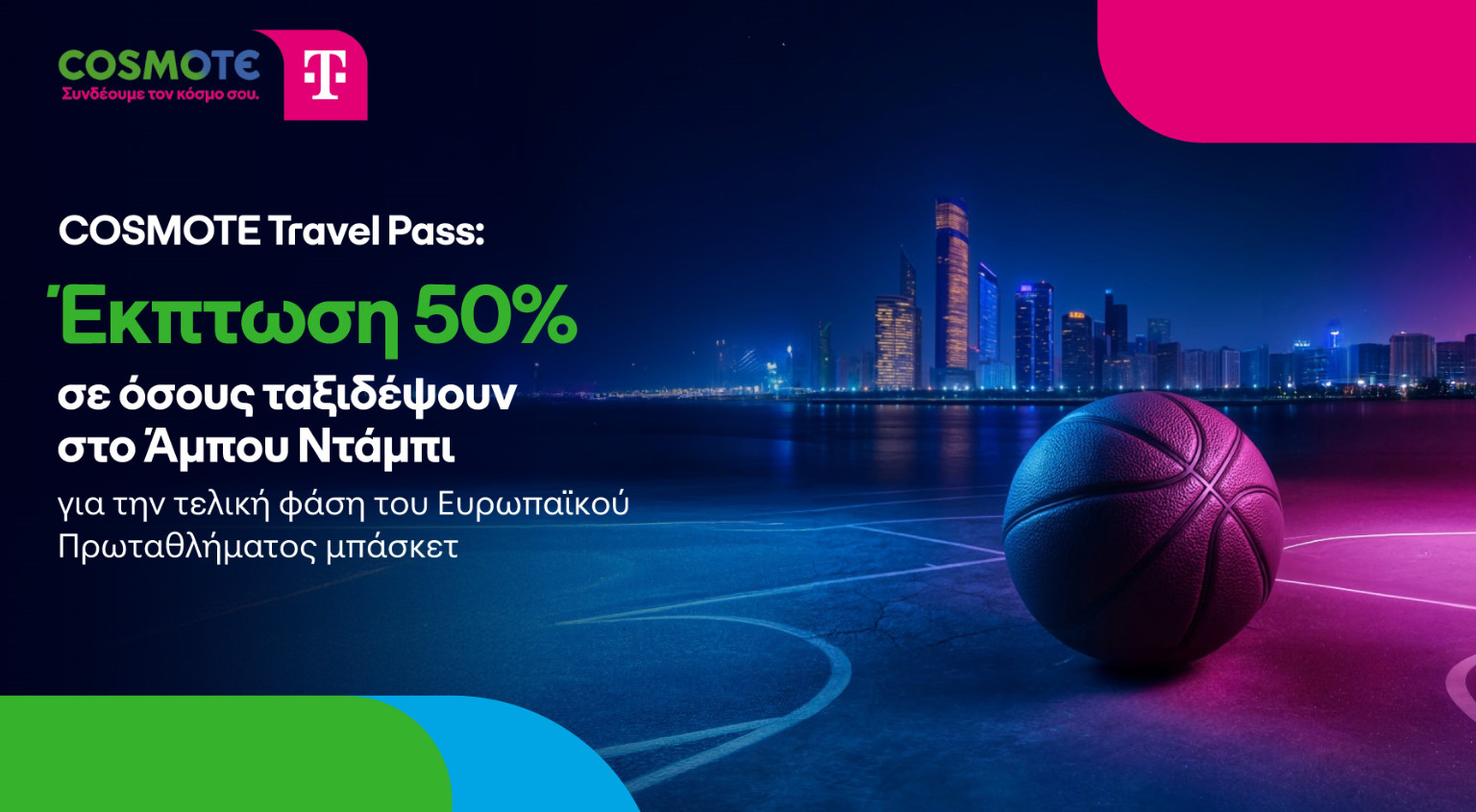 Έκπτωση 50% στην υπηρεσία COSMOTE Travel Pass προσφέρει η COSMOTE TELEKOM σε όσους συνδρομητές ταξιδέψουν στα Ηνωμένα Αραβικά Εμιράτα για να απολαύσουν από κοντά την τελική φάση των τεσσάρων του Ευρωπαϊκού Πρωταθλήματος μπάσκετ που θα διεξαχθεί στο Άμπου Ντάμπι από τις 23 έως τις 25 Μαΐου 2025. Ειδικότερα, το κόστος της ημερήσιας χρέωσης του COSMOTE Travel Pass στα Ηνωμένα Αραβικά Εμιράτα (ΗΑΕ) μειώνεται κατά 50%, από 14,29€ σε 7,15€, για το διάστημα 22 έως και 26 Μαΐου 2025. Η προσφορά ισχύει για όλους τους κατόχους οικιακών και εταιρικών προγραμμάτων κινητής COSMOTE TELEKOM.