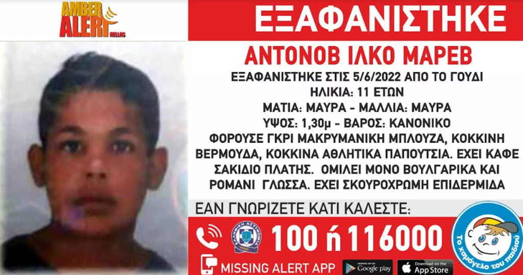 Συναγερμός στην αστυνομία για την εξαφάνιση ενός 11χρονου από το Γουδί. Πρόκειται για τον Αντόνοβ (επ.) Ίλκο Μάρεβ (ον.), 11 ετών, βουλγαρικής καταγωγής, όπως έκανε γνωστό το Χαμόγελο του Παιδιού.