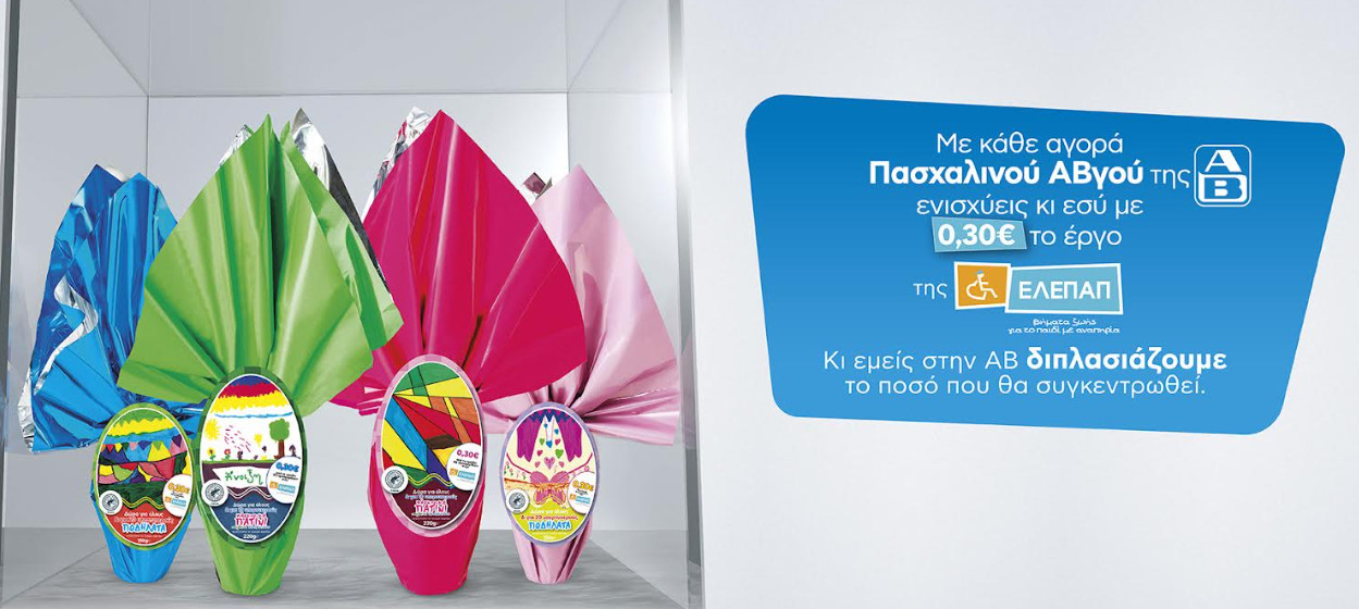 Φέτος, με κάθε αγορά ενός Πασχαλινού Αβγού της ΑΒ, οι πελάτες συνεισφέρουν με 0,30€ για τη στήριξη του έργου της ΕΛΕΠΑΠ, του πρώτου ελληνικού φιλανθρωπικού σωματείου στην Ελλάδα, το οποίο παρέχει υπηρεσίες αποκατάστασης σε παιδιά με αναπηρίες. Ταυτόχρονα, η ΑΒ Βασιλόπουλος διπλασιάζει το ποσό που θα συγκεντρωθεί για τις θεραπείες των γενναίων αυτών παιδιών.