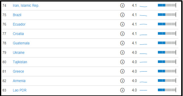 Μία «πολυφορεμένη» λέξη στην Ελλάδα των τελευταίων πέντε ετών. Παρά τις κατά καιρούς διαβεβαιώσεις για το αντίθετο, η Ελλάδα είναι 81η στον παγκόσμιο δείκτη ανταγωνιστικότητας του World Economic Forum. Ενδιαφέρον έχει ότι χώρες που ήταν σε Μνημόνιο, όπως η Ιρλανδία, η Ισπανία και η Πορτογαλία, είναι σε πολύ υψηλές θέσεις  (28η, 32η και 33η θέση αντίστοιχα),  τη στιγμή που η Ελλάδα είναι κάτω από το Τατζικιστάν, τη Μποτσουάνα και τη Σρι Λάνκα.
