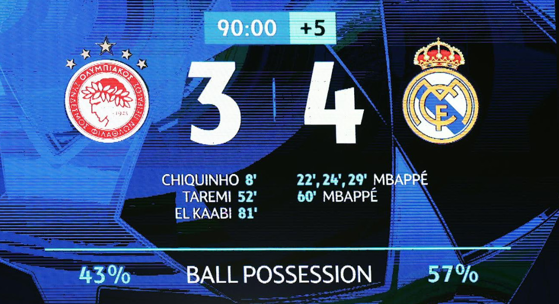 Επειδή όμως η Ρεάλ είναι η… Ρεάλ με τις όποιες απουσίες, έκανε την ανατροπή με συνοπτικές διαδικασίες. Πάρα πολύ εύκολα ο Εμπαπέ βρήκε τους χώρους και σκόραρε τρεις φορές στο πρώτο ημίχρονο. Ο Ολυμπιακός όμως δεν τα παράτησε και με επιμονή ότι τίποτα δεν έχει τελειώσει ξανά μπήκε στο παιχνίδι. Και τότε όμως η Ρεάλ λίγο ανέβασε ένταση και έκανε το 2-4. Ακόμη και τότε ουδείς εγκατέλειψε τη μάχη. Τα αμυντικά προβλήματα στην ομάδα του Αλόνσο ήταν εμφανή και ο Ελ Καμπί βρήκε το γκολ που τόσο έψαχνε. Στα τελευταία λεπτά που έμειναν, οι δύο τελικές του Ολυμπιακού σήκωσαν στο πόδι το γήπεδο και έδωσαν ελπίδα στον κόσμο. Μπορεί το γκολ να μην ήρθε, αλλά το γεγονός ότι ένα μεγάλο αποτέλεσμα ήταν τόσο κοντά είναι απολύτως ενθαρρυντικό.