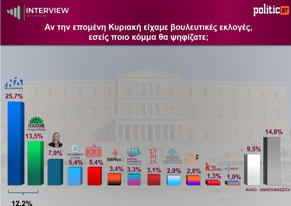 Νέα δεδομένα καταγράφονται στο πολιτικό σκηνικό, καθώς σύμφωνα με τη δημοσκόπηση της Interview για λογαριασμό της POLITIC.