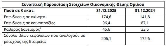 Η εύλογη αξία των επενδύσεων σε ακίνητα του Ομίλου ανήλθε την 31.12.2025 σε €174,6 εκατ. έναντι €141,8 εκατ. την 31.12.2024 και η εύλογη αξία των επενδύσεων σε κοινοπραξίες ανήλθε την 31.12.2025 σε €96,4 εκατ. (31.12.2024: €87,1 εκατ.).