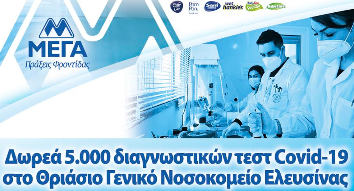 Σε μια δύσκολη περίοδο για τη χώρα και τους συνανθρώπους μας, η 100% ελληνική εταιρεία ΜΕΓΑ ΠΡΟΪΟΝΤΑ ΑΤΟΜΙΚΗΣ ΥΓΙΕΙΝΗΣ Α.Ε, μέσα από τη δωρεά 5.000 διαγνωστικών τεστ Cοvid-19 στο Θριάσιο Γενικό Νοσοκομείο Ελευσίνας, συνεχίζει να στηρίζει το Εθνικό Σύστημα Υγείας για την αντιμετώπιση της πανδημίας.