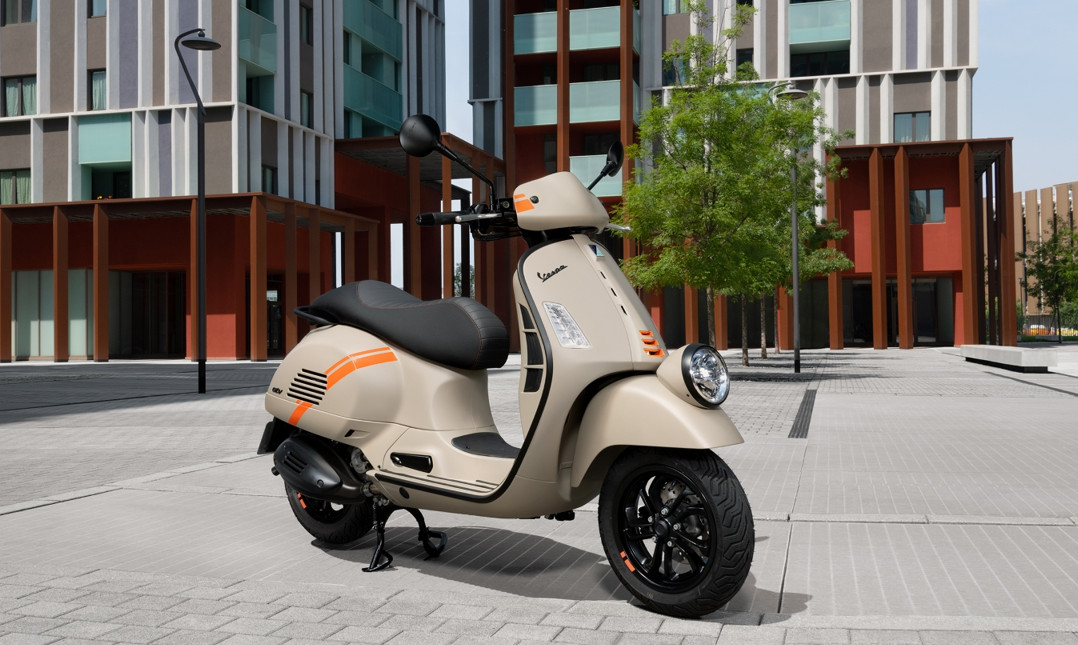 Η νέα Vespa Gtv είναι διαθέσιμη σε δύο αποχρώσεις, μπεζ ματ “Beige Avvolgente Opaco” και μαύρο γυαλιστερό “Nero Convinto”, με πορτοκαλί γραφικά στην μπροστινή μάσκα και τα πλαϊνά.