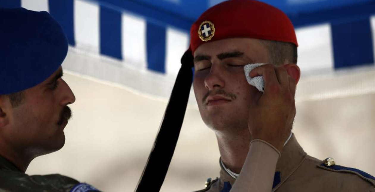 Κάποιοι πίνουν λίγο νερό για να δροσιστούν από τον καύσωνα. Κάποιοι κλείνουν τα μάτια για να τους σκουπίσουν τον ιδρώτα. Και το μόνο σίγουρο είναι ότι οι Εύζωνες – ακόμη και με αυτό τον καιρό – είναι εκεί όρθιοι και οι εικόνες τους κάνουν τον γύρο του Διαδικτύου.
