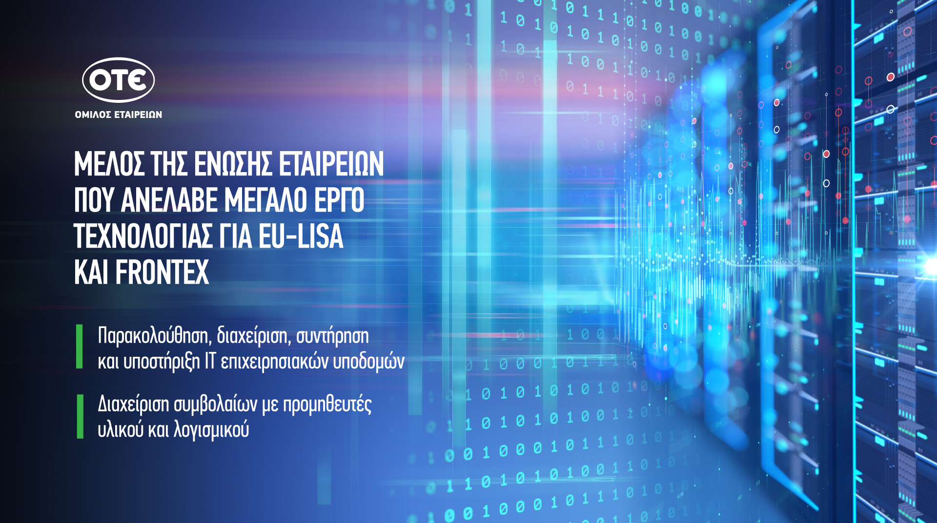 Στο πλαίσιο του έργου, o Όμιλος ΟΤΕ αναλαμβάνει την παρακολούθηση, διαχείριση, συντήρηση και υποστήριξη των δικτυακών υποδομών και των workstation των κεντρικών επιχειρησιακών συστημάτων. Επίσης, αναλαμβάνει την διαχείριση των συμβολαίων με προμηθευτές για τη συντήρηση του υλικού και λογισμικού των ICT υποδομών. Οι υπηρεσίες θα παρέχονται από ομάδα εξειδικευμένων και έμπειρων μηχανικών του Ομίλου από τις εγκαταστάσεις του στην Αθήνα, αλλά και με φυσική παρουσία στις εγκαταστάσεις του eu-LISA στο Στρασβούργο και της Frontex στη Βαρσοβία.