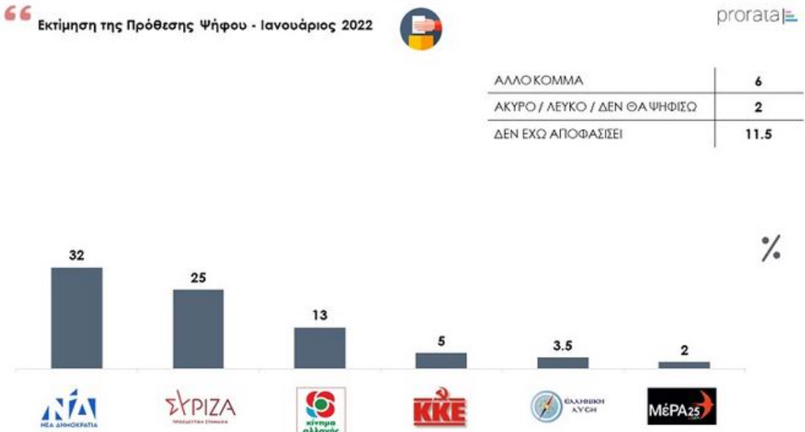 Στο δείκτη μέτρησης της πρόθεσης ψήφου η Νέα Δημοκρατία λαμβάνει 32%, ο ΣΥΡΙΖΑ 25%, το ΚΚΕ 5%, η Ελληνική Λύση 5% και το ΜεΡΑ25 2%. Μοναδική εξαίρεση η εκλογική επιρροή του Κινήματος Αλλαγής / ΠΑΣΟΚ, η οποία διευρύνεται σταθερά, φθάνοντας στην παρούσα έρευνα το 13%.