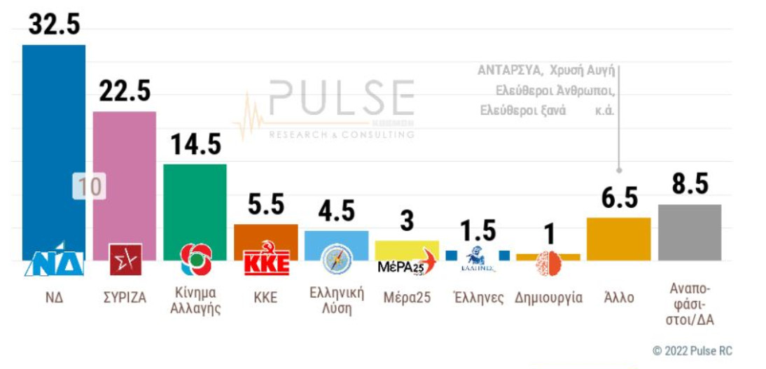 Αναλυτικά, η ΝΔ συγκεντρώνει 32,5%, ο ΣΥΡΙΖΑ 22,5% και ακολουθούν το Κίνημα Αλλαγής με 14,5%, το ΚΚΕ με 5,5%, η Ελληνική Λύση με 4,5%, το ΜέΡΑ25 με 3% και οι Έλληνες με 1,5%. Υψηλό ποσοστό της τάξεως του 8,5% συγκεντρώνουν οι αναποφάσιστοι και όσοι απάντησαν «άλλο» με ποοστό 6,5%.