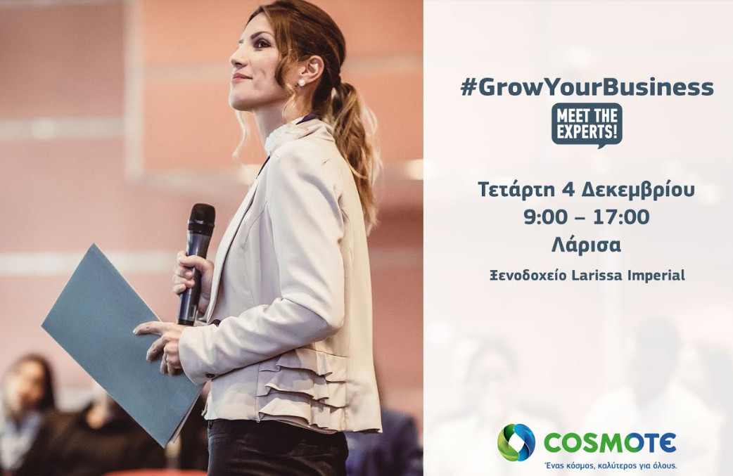 Στην Λάρισα θα πραγματοποιηθεί η επόμενη δωρεάν ημερίδα #GrowYourBusiness – Meet Τhe Experts της COSMOTE, που δίνει τη δυνατότητα σε μικρομεσαίες επιχειρήσεις και ελεύθερους επαγγελματίες να γνωρίσουν experts από διάφορους κλάδους και να αντλήσουν έμπνευση και ιδέες για την επιχείρησή τους. Μετά τις επιτυχημένες ημερίδες σε Θεσσαλονίκη, Αθήνα και Ηράκλειο Κρήτης, το «Meet The Experts» ταξιδεύει την Τετάρτη 4 Δεκεμβρίου στην Λάρισα, στο Larissa Imperial Hotel (Φαρσάλων 182).