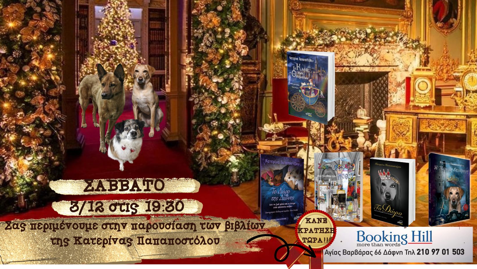 Το Σάββατο 3 Δεκεμβρίου 2022 στις 7: 30 το απόγευμα θα πραγματοποιηθεί στο παραμυθένιο Booking Hill στη Δάφνη (Αγίας Βαρβάρας 66, 2109701503 τηλ. για κρατήσεις) η πρώτη επίσημη κοινή παρουσίαση όλων των βιβλίων της εκπαιδευτικού- ζωοθεραπεύτριας και ιδρύτριας της αμκε Ζω.Ε.Σ. (Ζωοφιλικές Ενημερώσεις Σχολείων) Κατερίνας Παπαποστόλου που κυκλοφορούν από τις εκδόσεις WELLDONE.