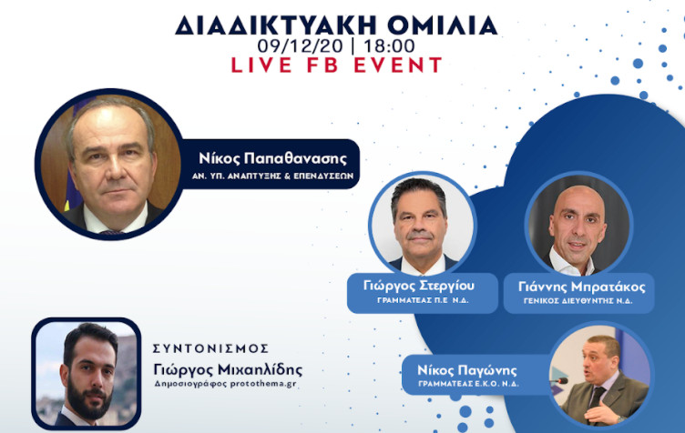Η πρώτη διαδικτυακή ομιλία θα διεξαχθεί την Τετάρτη, 9 Δεκεμβρίου στις 18.00 μμ. Πρώτος κεντρικός ομιλητής θα είναι ο Αναπληρωτής Υπουργός Ανάπτυξης και Επενδύσεων, Αρμόδιος για τις Ιδιωτικές Επενδύσεις και τις Συμπράξεις Δημόσιου και Ιδιωτικού Τομέα Νίκος Παπαθανάσης, ο οποίος θα εστιάσει σε πολιτικές και δράσεις του Υπουργείου που έμπρακτα προσφέρουν εργαλεία επιβίωσης και ανάπτυξης των μικρομεσαίων επιχειρήσεων ειδικά τον καιρό της πανδημίας. Χαιρετισμό θα απευθύνουν ο Γραμματέας της Πολιτικής Επιτροπής της Ν.Δ. Γιώργος Στεργίου και ο Γενικός Διευθυντής της Νέας Δημοκρατίας Γιάννης Μπρατάκος, ενώ θα παρέμβει ο Γραμματέας Ειδικών Κομματικών Οργανώσεων της Ν.Δ. Νίκος Παγώνης. Τη συζήτηση θα συντονίσει ο δημοσιογράφος Γιώργος Μιχαηλίδης.