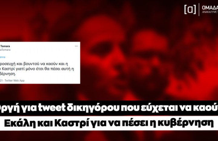 Ελλάδα·Επικαιρότητα 06/08 Δικηγόρος εύχεται να καούν Εκάλη και Καστρί για να πέσει η κυβέρνηση! Τweet της πρώην δικηγόρου των «8» Τούρκων στρατιωτικών, Σταυρούλας Τομαρά, με το οποίο απροκάλυπτα εύχεται να καούν περιοχές για να πέσει η κυβέρνηση