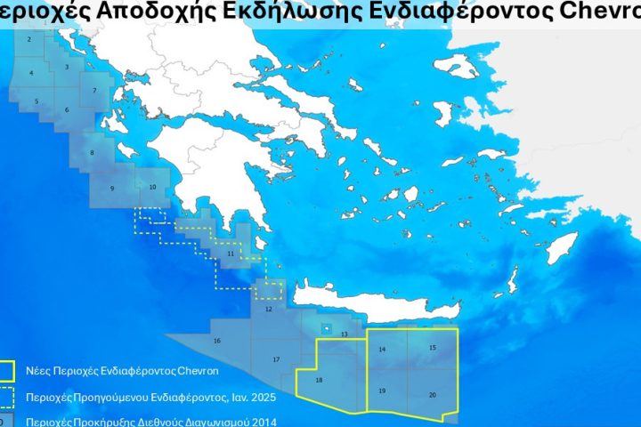 Αποδεκτή έγινε από το υπουργείο Περιβάλλοντος και Ενέργειας η εκδήλωση ενδιαφέροντος της αμερικανικής Chevron για έρευνες υδρογονανθράκων σε δύο νέες θαλάσσιες περιοχές, Νότια Κρήτη Ι και Νότια Κρήτη ΙΙ.