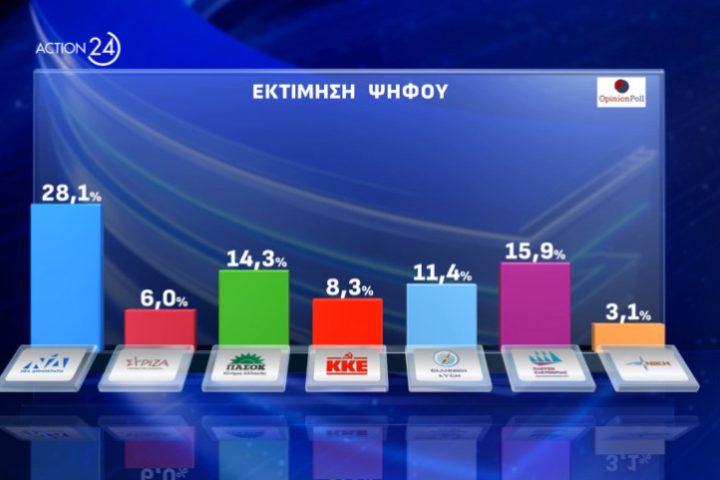 Στη δεύτερη θέση βρίσκει το κόμμα της Ζωής Κωνσταντοπούλου η έρευνα της Opinion Poll που παρουσιάστηκε στο κεντρικό δελτίο του Action 24, ενώ ο Κυριάκος Μητσοτάκης διατηρεί πολύ μεγάλο προβάδισμα για την