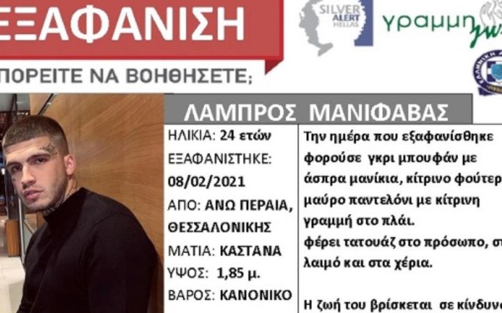 Silver alert για τον 24χρονο ράπερ που αγνοείται Ο Λάμπρος Μανιφάβας, 24 ετών, εξαφανίστηκε από το σπίτι του στην περιοχή Ραντάρ, στην Άνω Περαία Θεσσαλονίκης. Έχει καστανά μάτια, ύψος 1,85μ 10/02 Ελλάδα·Επικαιρότητα