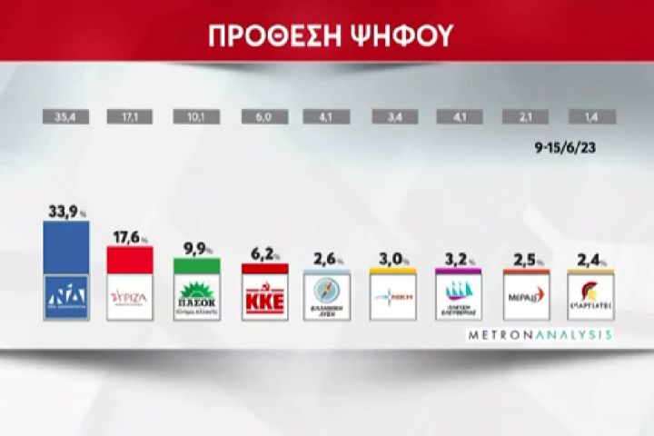 Στις 16,3 ποσοστιαίες μονάδες δίνει τη διαφορά της ΝΔ έναντι του ΣΥΡΙΖΑ δημοσκόπηση της Metron Analysis που διενεργήθηκε για λογαριασμό του κεντρικού δελτίου ειδήσεων του MEGA. Συγκεκριμένα, η ΝΔ συγκεντρώνει 33,9% και ο ΣΥΡΙΖΑ