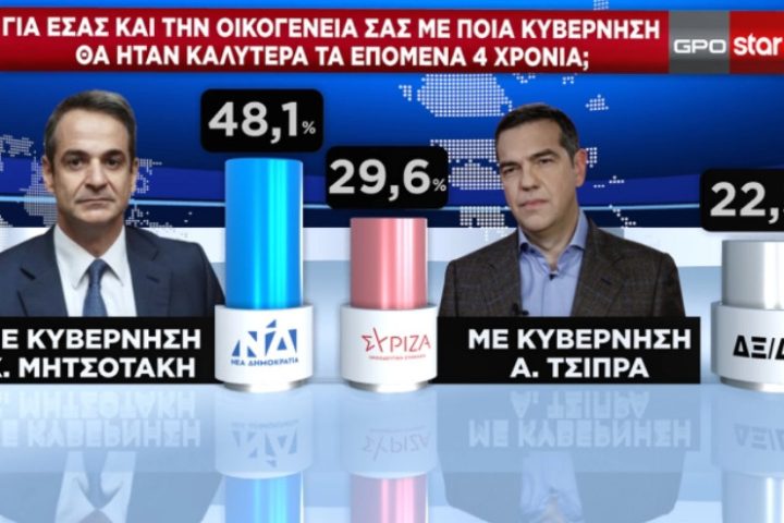 Προβάδισμα 6,3  μονάδων στη Νέα Δημοκρατία –  διευρυμένο κατά 1,5 μονάδα σε σχέση με την προηγούμενη έρευνα, στις αρχές Απριλίου – καταγράφει στην πρόθεση ψήφου η δημοσκόπηση της GPO που παρουσιάστηκε στο κεντρικό δελτίο ειδήσεων