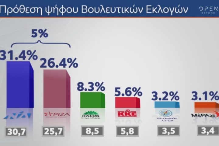 GPO: Στις 6,3 μονάδες το προβάδισμα της ΝΔ στην πρόθεση ψήφου