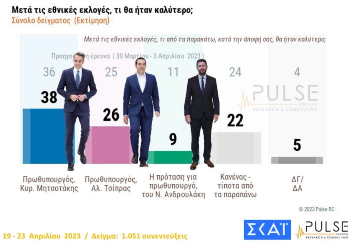 Μιάμιση μονάδα κέρδισε η Νέα Δημοκρατία στην «καθαρή» πρόθεση ψήφου σε σχέση με τις αρχές Απριλίου, σύμφωνα με δημοσκόπηση της Pulse που παρουσιάστηκε στο κεντρικό δελτίο του Σκάι, ενώ ο ΣΥΡΙΖΑ παρέμεινε στάσιμος