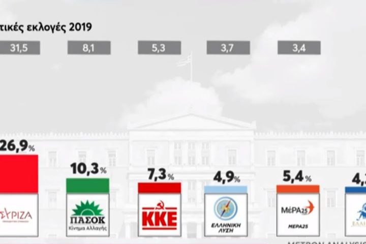 Στην τελική ευθεία προς τις βουλευτικές εκλογές η ΝΔ προηγείται στην πρόθεση ψήφου του ΣΥΡΙΖΑ με 5.9% και στην πρόθεση ψήφου με αναγωγή επί των εγκύρων με διαφορά 6.2%, σύμφωνα με την πανελλαδική δημοσκόπηση της