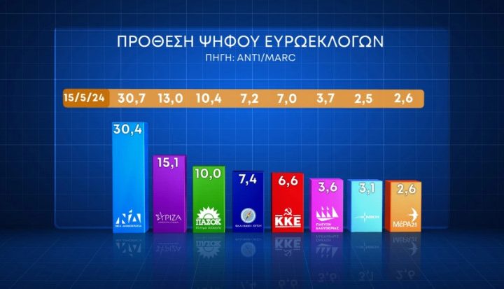 Προβάδισμα 16,9 μονάδων για τη Νέα Δημοκρατία στην εκτίμηση αποτελέσματος για τις ευρωεκλογές της 9ης Ιουνίου δίνει η τελευταία δημοσκόπηση της εταιρείας Marc που έγινε για λογαριασμό του ANT1 και παρουσιάστηκε στο κεντρικό δελτίο ειδήσεων του
