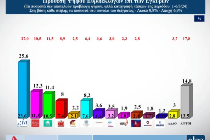 ALCO: Από 29% έως 33% η ΝΔ, από 14%-16% ο ΣΥΡΙΖΑ, στο 12%-14% το ΠΑΣΟΚ