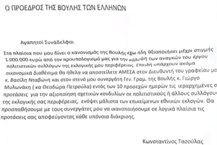 Αδιανόητη φάρσα στη Βουλή, με fake επιστολή που φέρεται να έστειλε ο πρόεδρος του Κοινοβουλίου Κων/νος Τασούλας, με την οποία υπόσχεται λεφτά στους βουλευτές για τον προεκλογικό αγώνα.